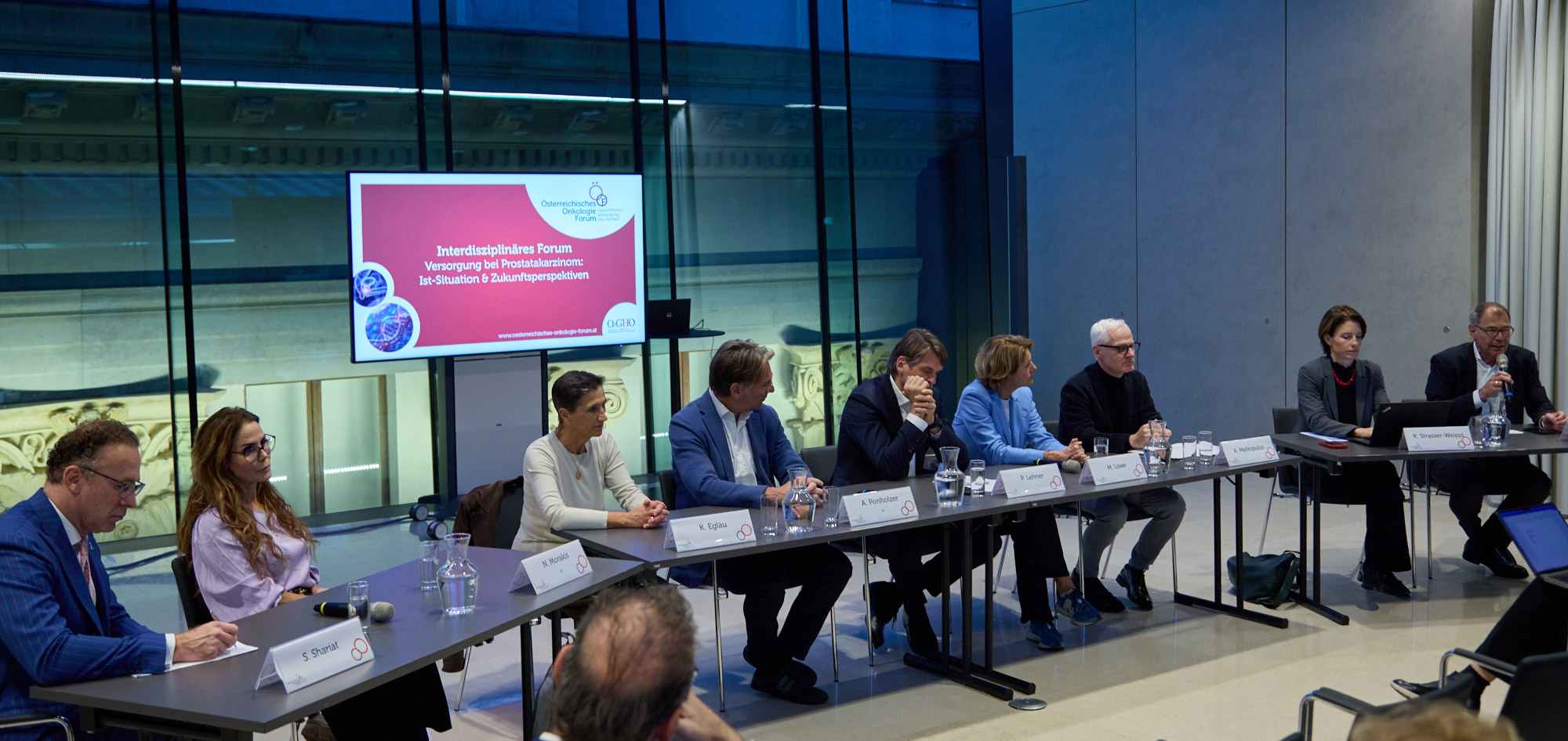 Am Podium von links nach rechts: Univ.-Prof. Dr. Shahrokh Shariat, Dr.in Nike Morakis, Dr. Karin Eglau, Prim. Priv.-Doz. Dr. Anton Ponholzer, Peter Lehner, Mag.a Martina Löwe, Dr. Arno Melitopulos, Priv.-Doz.in Dr.in Kathrin Strasser-Weippl, Prim. Univ.-Prof. Dr. Ewald Wöll
